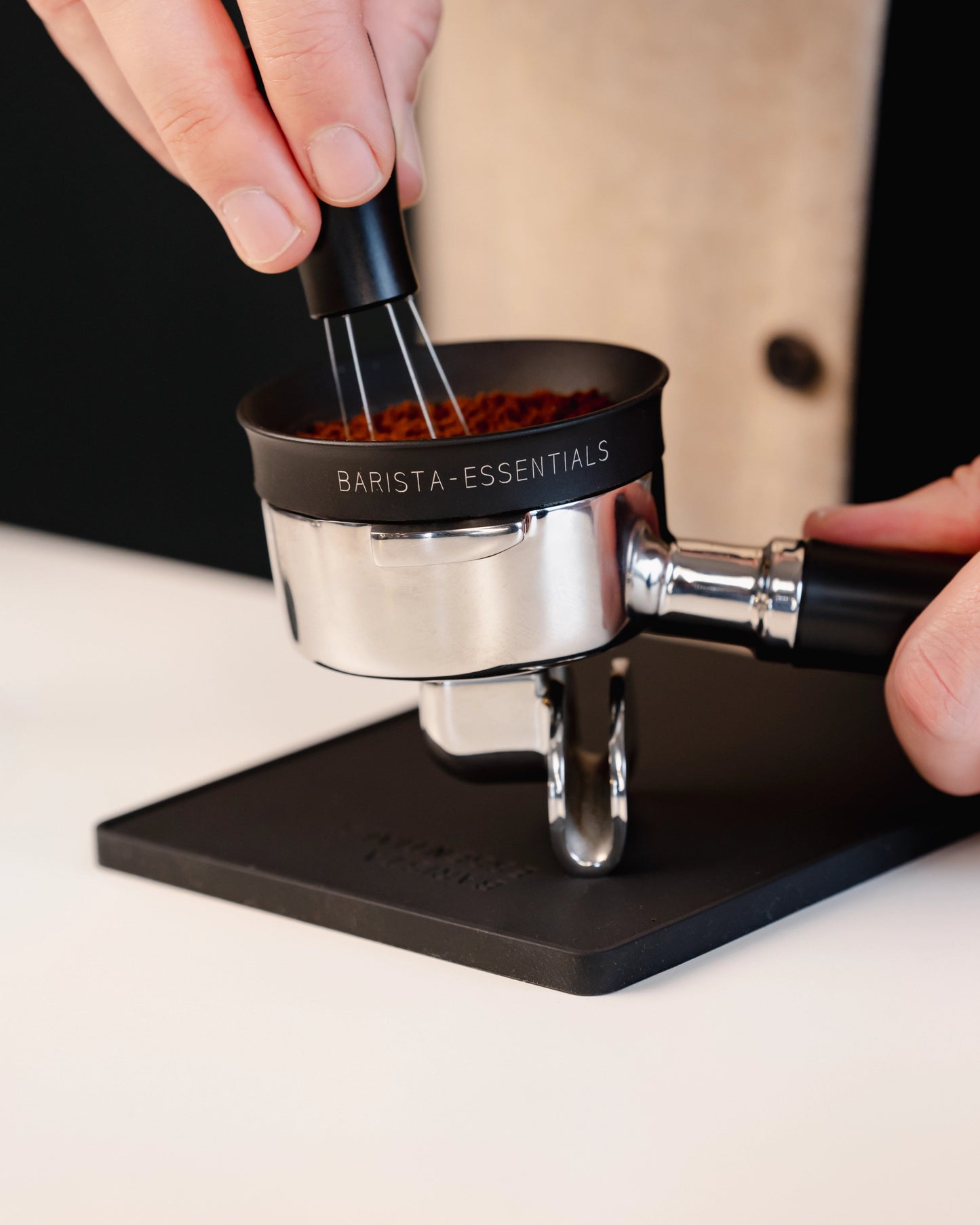 So we at Barista-Essentials started looking for a solution. We found plenty of tamping mats in the strangest shapes, often with designated spaces for your tamper (as if you don’t have other barista tools).