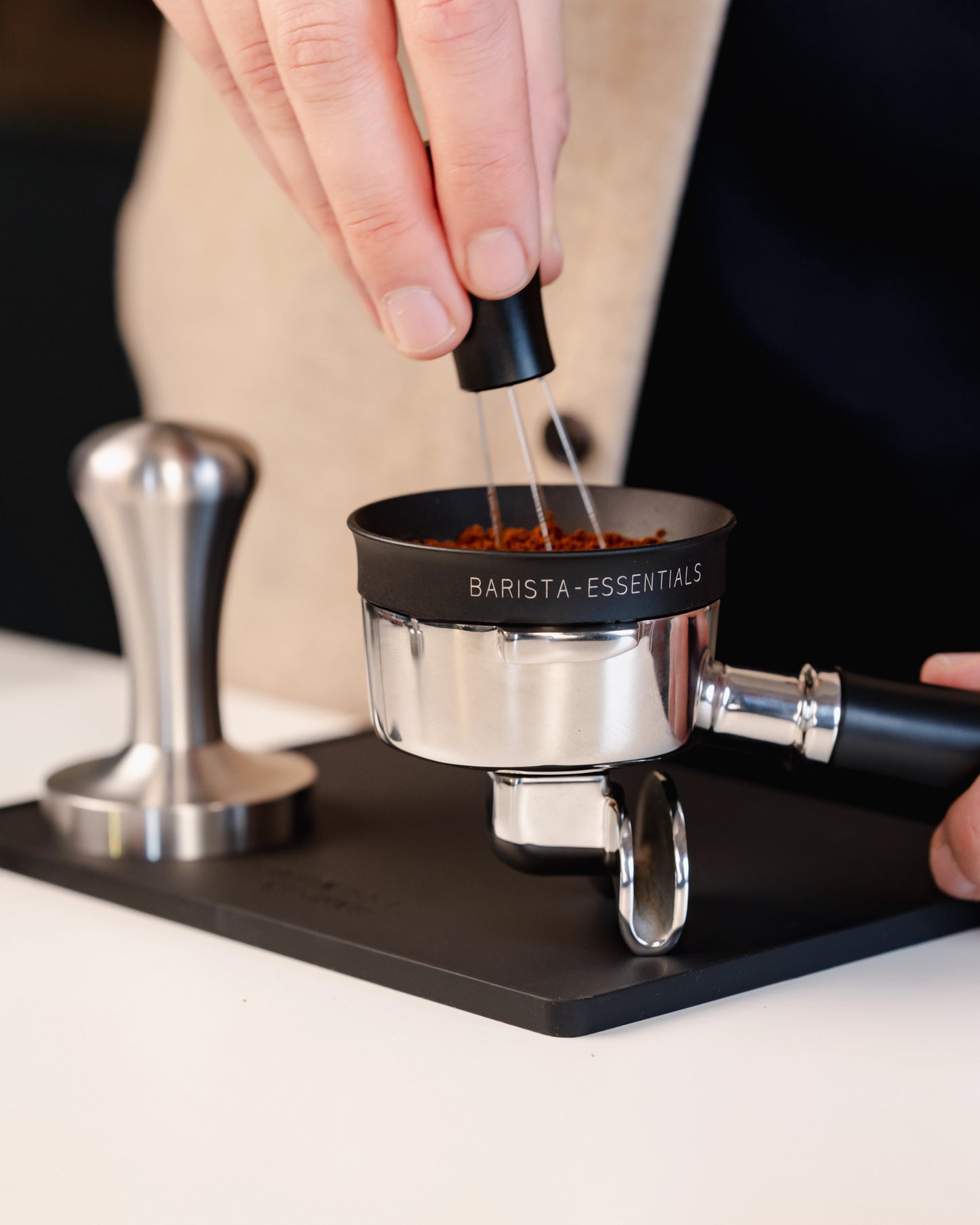 So we at Barista-Essentials started looking for a solution. We found plenty of tamping mats in the strangest shapes, often with designated spaces for your tamper (as if you don’t have other barista tools).