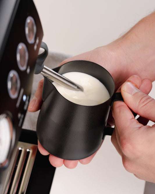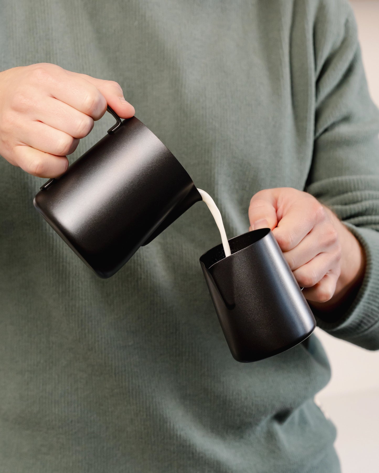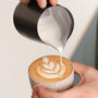 Pouring the milk between two pitchers breaks down bubbles and blends the foam for that silky-smooth texture. It's a small step that makes a huge difference, especially when you want your designs to look clean and professional.